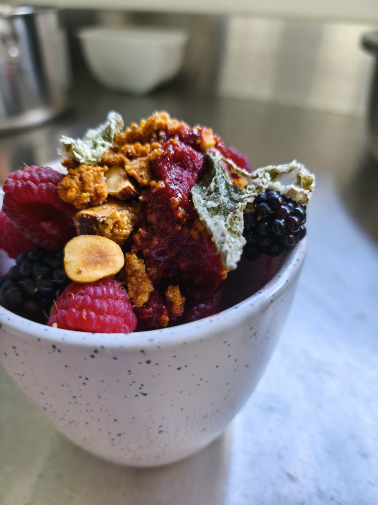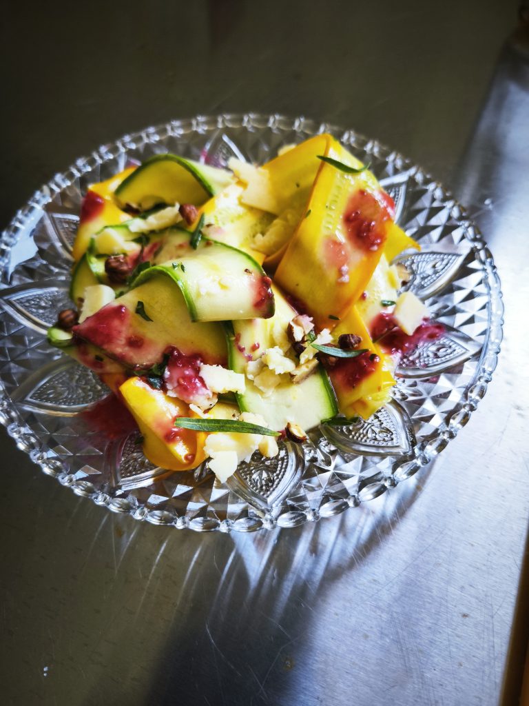 Comme nous cultivons plantes aromatiques , légumes, fruits , miel, le menu dégustation que nous proposons est essentiellement végétal. Cependant certains produits d’origine animale font parfois partie du menu ( beurre, œuf, crème, fromage,…)